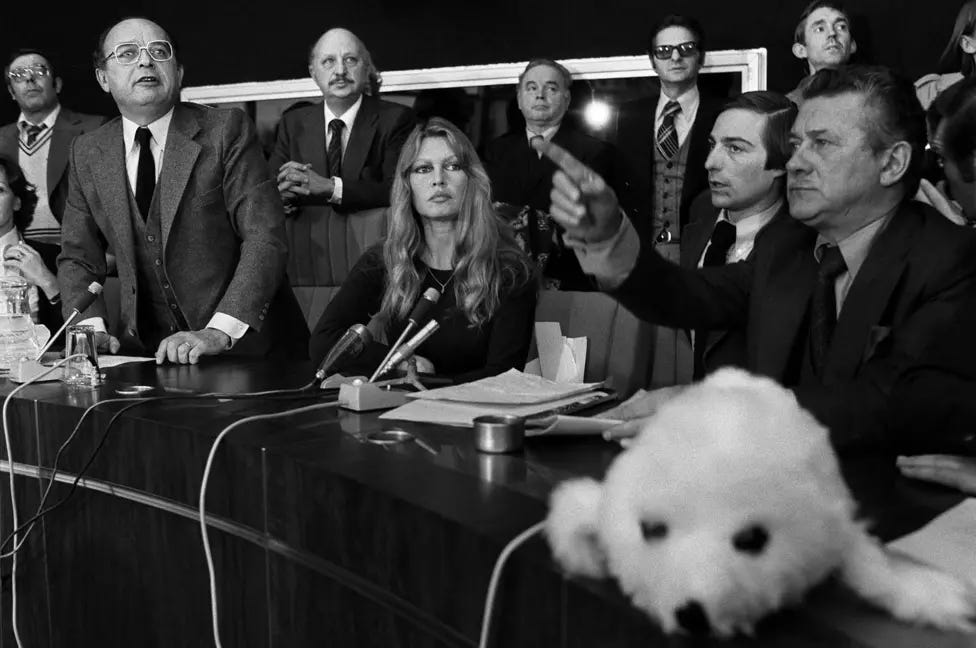 As if that wasn’t bad enough, Bardot’’s uninhibited public pronouncements came increasingly into conflict with the tightening legal framework criminalising insults, above all those capable of being characterised as racist, the summum of all evil. Her 1997 autobiography Initiales BB earned her a number of prosecutions for comments on the cruelty and alien nature of Islamic halal butchery and the excessive scope of immigration, and she was sued by her second husband and their son for describing the horror she’d felt at the unwanted pregnancy. The degree of establishment animosity she faced then is worth recalling via old TV footage such as the talk show in which she defended herself with dignity against an unstoppable barrage of yapping condemnation from a puffed-up young presenter for France 3 state TV, with a studio audience sporadically plucking up enough courage to defy the Rive Gauche morality gendarme and applaud her.